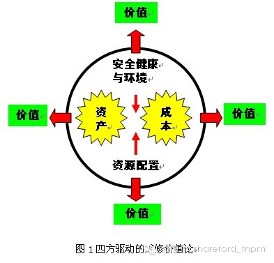维修价值论认为维修是由四个方面的价值驱动的,它们分别是:资产利用,成本,安全健康与环境以及资源配置。其中资产利用和成本是最基本的价值,维修或者维护、设备管理的核心就在于提高资产利用率,降低维护成本;同时还要兼顾到职业健康、生产安全和环境保护;合理的资源配置也是维修管理价值的主要体现。如图1所示。