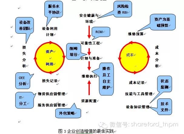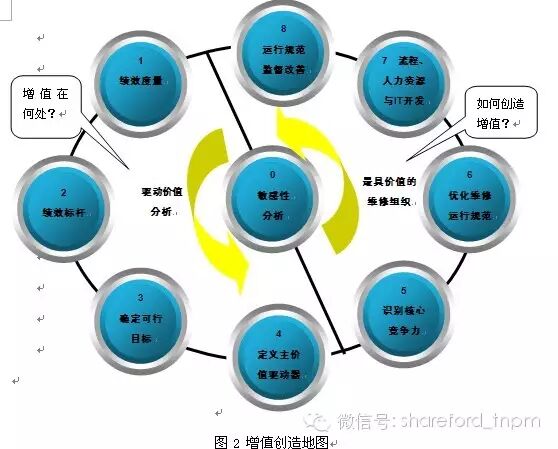 要引导企业关注主要的价值驱动器,因为主要价值驱动器是具有巨大增值潜力。而分析主要价值驱动因素并不困难,至少每年一次。关键的维修策略要放在主要价值驱动器上,随着时间推移,主要价值驱动器也会变化。图2给出了创造增值的地图。从图中我们可以回答何处可以让我们创造增值,如何才能真正实现增值的创造。