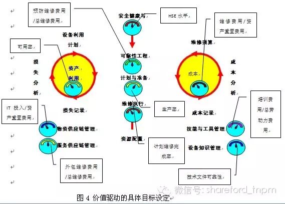 企业维修的核心竞争能力一方面是通过损失分析、设备利用计划、物资(备件)供应链管理以及维修服务供应链管理来提升资产利用效率,另一方面是通过成本分析、维修预算、设备知识管理以及技能工具的开发,使成本得到有效控制。维修的执行既有安全健康环境的价值驱动,又有资源配置的价值驱动。如图3所示企业要设定每年增值的具体目标,包括预防维修占总维修费用的比例、设备的可用率、维修费用占资产重置费用的比例、外包维修费用占总维修费用的比例、员工培训费用占维修费用比例、计划维修完成率、健康安全环境水平、技术文件的可靠性、设备生产率、信息化投入占资产总值比例等。如图4所示。