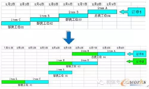 “有限能力”体现在工位上设备和人员的数量,换个角度来说,即此工位同时可装配任务的数量。下图所示工位01的能力不能同时满足订单1与订单2在8月2日到3日两天的时间段内的生产负荷,所以,在编制生产计划时,自动将订单2在部装工位01的生产计划向前推移2天,移至该工位的空闲时间段。
