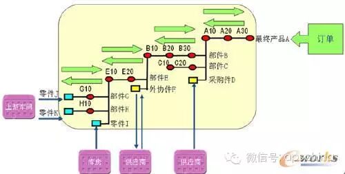 上图1为柔性装配现场模拟示意图,在装配车间,最终产品A出厂之前需要由部件B、C和采购件D经过A10、A20、A30三个装配工位进行组装,每个工位的加工时间按照固定的时间节拍(如2天)。以此类推,部件B和C也有自己的装配工艺,在其相应的装配工位上都按照节拍进行装配。这样,在整个装配车间,如果每级部件的装配都可以在各工位上按照特定的节拍进行的话,A产品的产出就可以保持一定的节拍。以A产品的产出时间(客户的需求时间)进行倒推,即可编制出各级子部件在每个工位上的装配计划,以及各采购、外协物资的配送时间。上游机加工车间的零件以及不能确定特定节拍的装配部件,可以以预投生产的方式,设置一定规模的库存保有数量,以备装配的需求。从上图可以看出,每个订单产品在装配过程中以“一个流”的生产模式在各工位上以固定的节拍顺序流转。