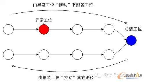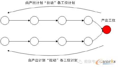 在实际生产过程中,如果某个工位出现了“异常”情况,如:物料供应不及时、机器故障、人为拖期等,导致该工位生产计划进行了调整,那么,整个单件产品在下游各个工位的生产计划也会相应的进行推动式调整。如图4所示。