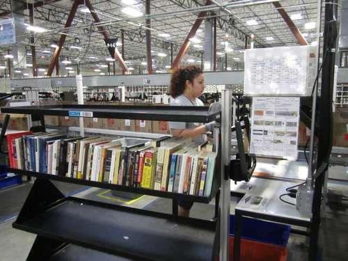 3. 经过扫描后的货品,随后被摆在蓝色的架子上等待上架,有专门负责上架的员工会把这些货品推走,进行第二次扫描并放在工作车上,随后这些货品会在数小时之内摆放在货架上,而从货品上架那一刻起,用户就能够在amazon.com上看见并且进行购买。