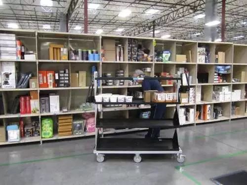 4. 亚马逊独有的上货特色是:随意摆放、人动货不动。负责上架的员工,会根据行走的路线,以及货架上是否有空间,随意摆放并扫描至系统里。这样做的好处是,缩短捡货的距离。