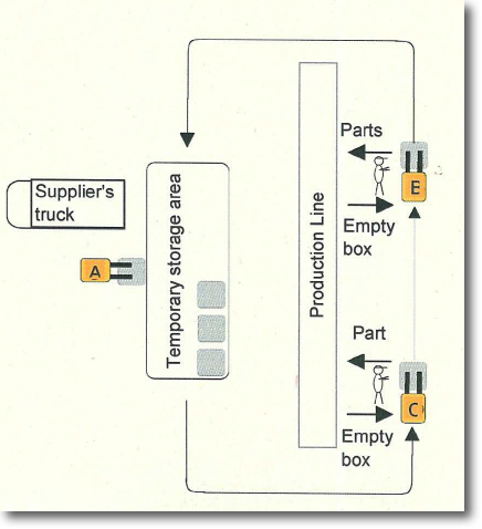 ■零部件被临时堆放在储存区域,并由叉车B、C向装配线进行配给。(由于1台叉车一次只能运送一托盘货物,所以需要有2台叉车轮流运送配给)
