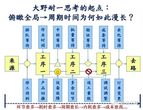 为了缩短生产周期时间,大野耐一便开始着手分析整个生产过程的时间流失情况,发现大部份的时间都是在各种等待中流失掉的,所以在早期(1952年以前),清除各种等待时间便成为其最主要的攻关课题。