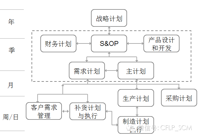 有效的S&OP是一个双向的协调机制。自上而下的目标是落实战略,自下而上的目标是激发创新和反馈问题。如图三,从年度战略计划层层展开,最后细化到季度计划、月计划(注:企业的S&OP通常不会细化到周或日计划,这一部分的计划达成最有效的做法是依托于执行层面的快速反应,所谓将在外军令有所不为是同样的道理),而每一层的计划达成都是双向沟通的结果。