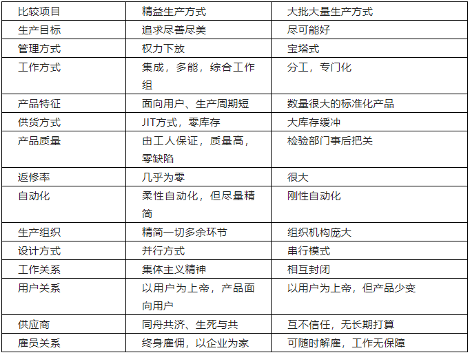 精益生产与大批量生产方式的比较: