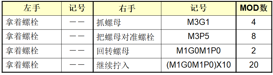 手腕的往复动作M2,每一个单程动作的时间为1MOD;